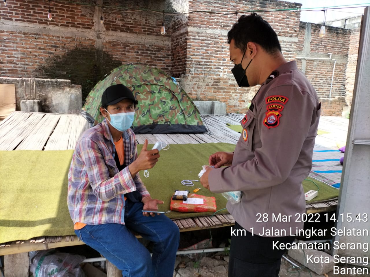 Serang – Rajin lakukan sambang kepada masyarakat guna mencegah penyebaran Covid-19 terutama varian Omicron, personel Subdit Bhabinkamtibmas Ditbinmas Polda Banten Bripda Biski mengedukasi masyarakat terkait Protokol Kesehatan (Prokes) dan bagikan masker gratis kepada masyarakat di sekitar Jalan Lingkar Selatan, Ciracas, Kota Serang pada Senin (28/03)