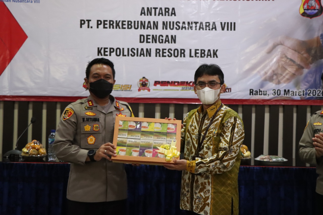 Dalam penandatanganan MoU kerjasama tersebut Kapolres Lebak memberikan cendera mata Pimpinan PT. Perkebunan Nusantara VIII.