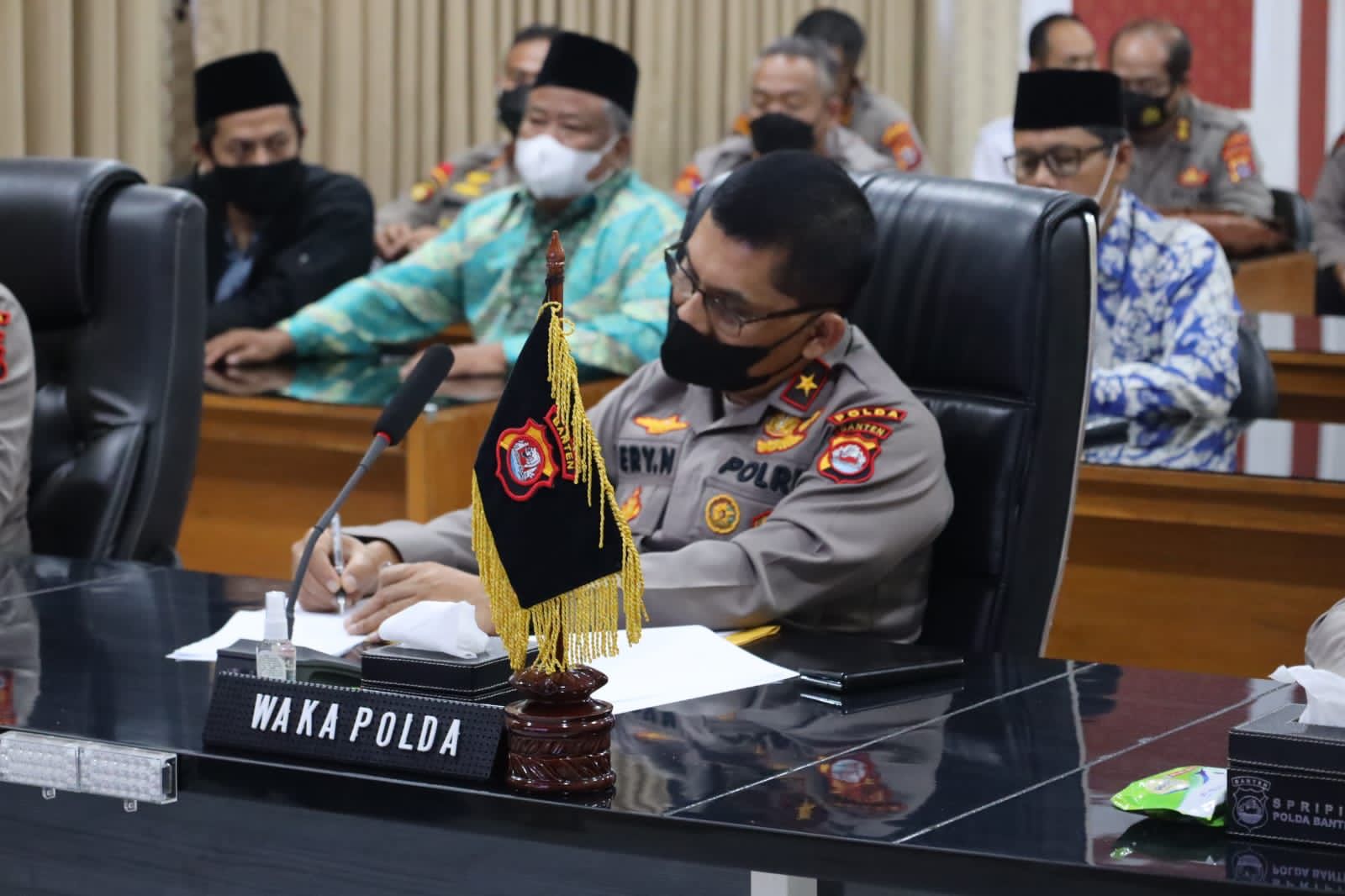 Kegiatan ini dihadiri Wakapolda Banten Brigjen Pol Ery Nursatari didampingi Ketua MUI Banten KH. TB. Hamdi Ma’ani dan Ketua Pengurus Wilayah Nahdlatul Ulama (PWNU) Banten KH Bunyamin Hafidz beserta Pejabat Utama Polda Banten dan Kapolres jajaran yang diikuti melalui zoom meeting.