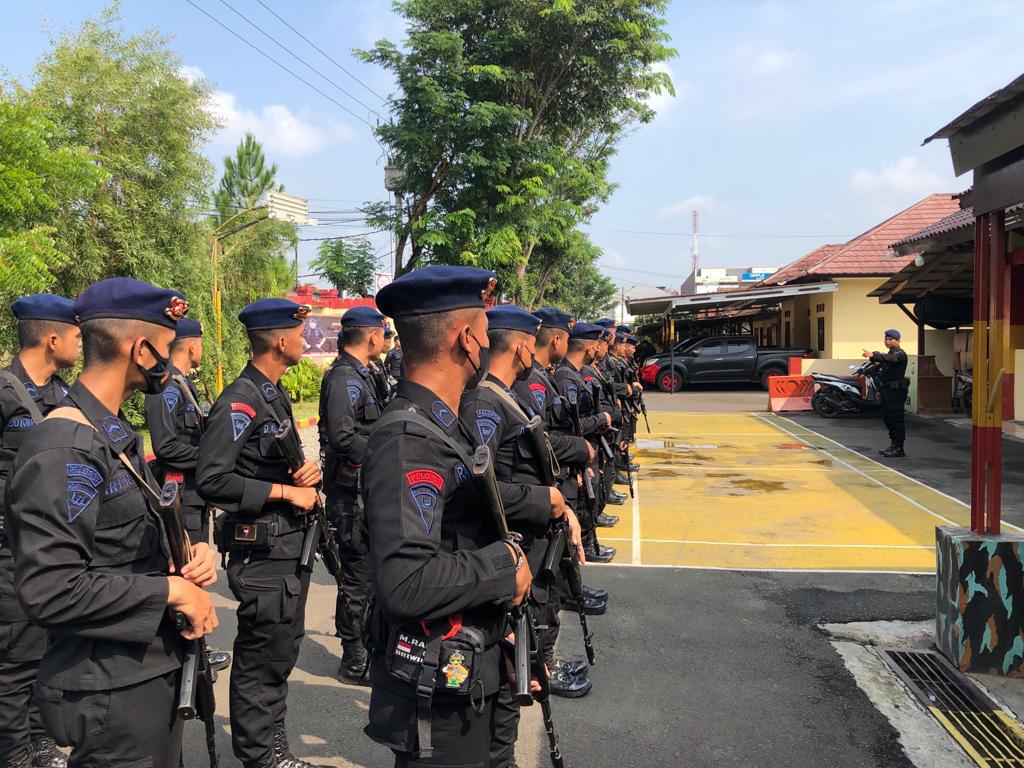 Serang – Personel dari Batalyon A Pelopor Sat Brimob Polda Banten laksanakan peningkatan kemampuan lapangan brigade mobile (KLBM) di halaman Mako Brimobda Banten, Kamis (19/05).