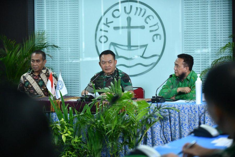 JAKARTA,- Kepala Staf Angkatan Darat (KSAD) Jenderal TNI Dudung Abdurachman berkunjung ke Persekutuan Gereja-Gereja Indonesia (PGI) Pusat di Salemba, Jakarta Pusat, Selasa (30/5/2022).