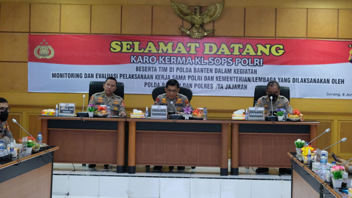 Serang – Wakapolda Banten Brigjen Pol Drs. Ery Nursatari menerima kunjungan kerja Tim SOPS Mabes Polri dalam rangka Monitoring dan Evaluasi (Monev) pelaksanaan kerja sama Polri dan kementrian atau lembaga yang dilaksanakan oleh Polda Banten, Polres dan Polresta jajaran di Rupatama Polda Banten pada Rabu (08/06).
