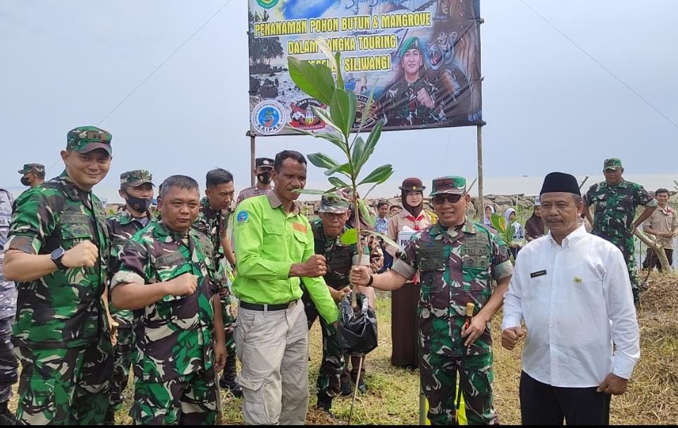 Di kampung Sinar Laut desa Panimbang lokasi penanaman Pohon, Danrem 064/MY beserta Rombongan secara simbolik melakukan penanamam. Disiapkan sebanyak 5000 batang pohon mangrove/Butun yang siap tanam.