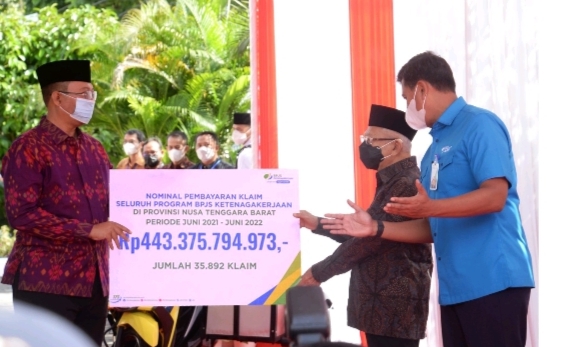 LOMBOK, (haluanbanten.co.id) – Wakil Presiden Ma’ruf Amin menyerahkan santunan program BPJS Ketenagakerjaan (BPJAMSOSTEK) senilai Rp443 miliar yang secara simbolis diterima oleh Gubernur Nusa Tenggara Barat (NTB) Zulkieflimansyah. Penyerahan simbolis tersebut didampingi Direktur Utama BPJAMSOSTEK Anggoro Eko Cahyo dan Dirjen Rehabilitasi Sosial Kemensos RI Pepen Nazaruddin pada kunjungan kerja Wapres di Lombok NTB, Jumat (1/7).