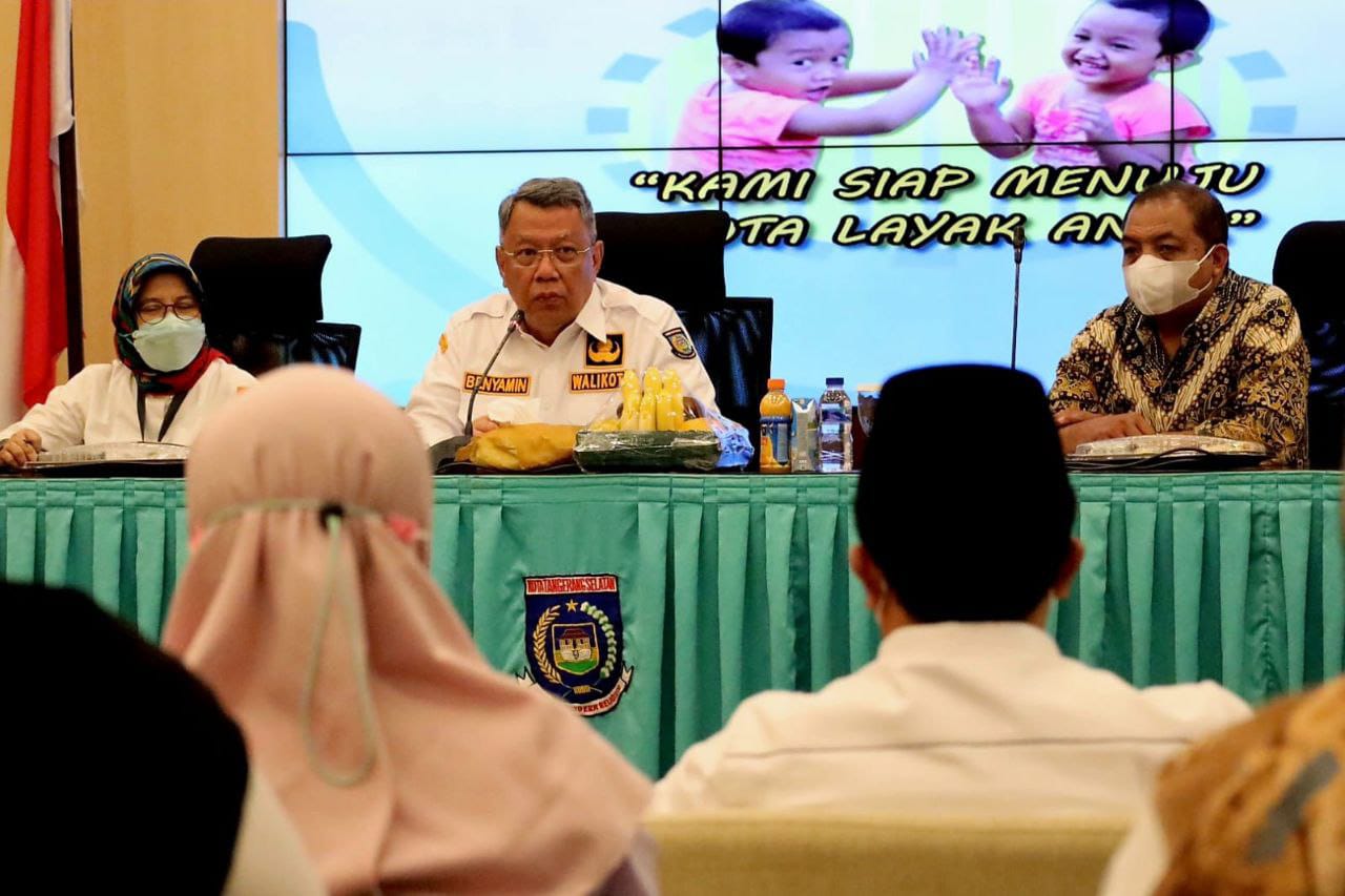 Tim Verifikasi Lapangan Evaluasi Kota Layak Anak diterima secara langsung oleh Wali Kota Benyamin Davnie beserta jajaran dari dinas terkait di Aula Blandongan, Puspemkot Tangsel. Rabu (6/7).