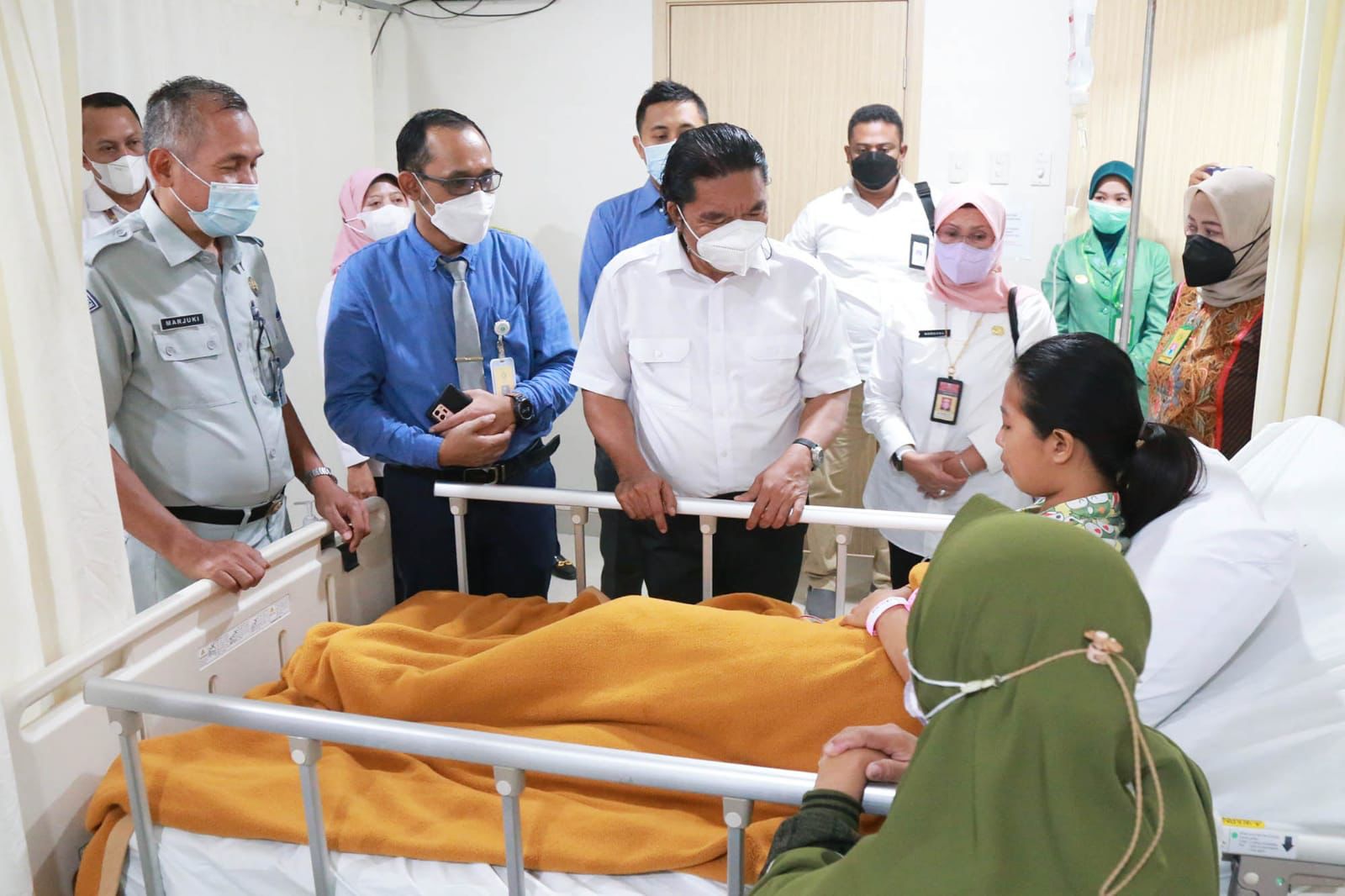 Penjabat (Pj) Gubernur Banten Al Muktabar menjenguk 9 korban kecelakaan antara kereta api dan mobil odong-odong yang masih dirawat di Rumah Sakit (RS) Hermina, Jl Raya Serang – Jakarta Km. 9 Ciruas, Kabupaten Serang Rabu (27/7/2022). Hal itu untuk memastikan perawatan yang diterima para korban tertangani dengan baik.