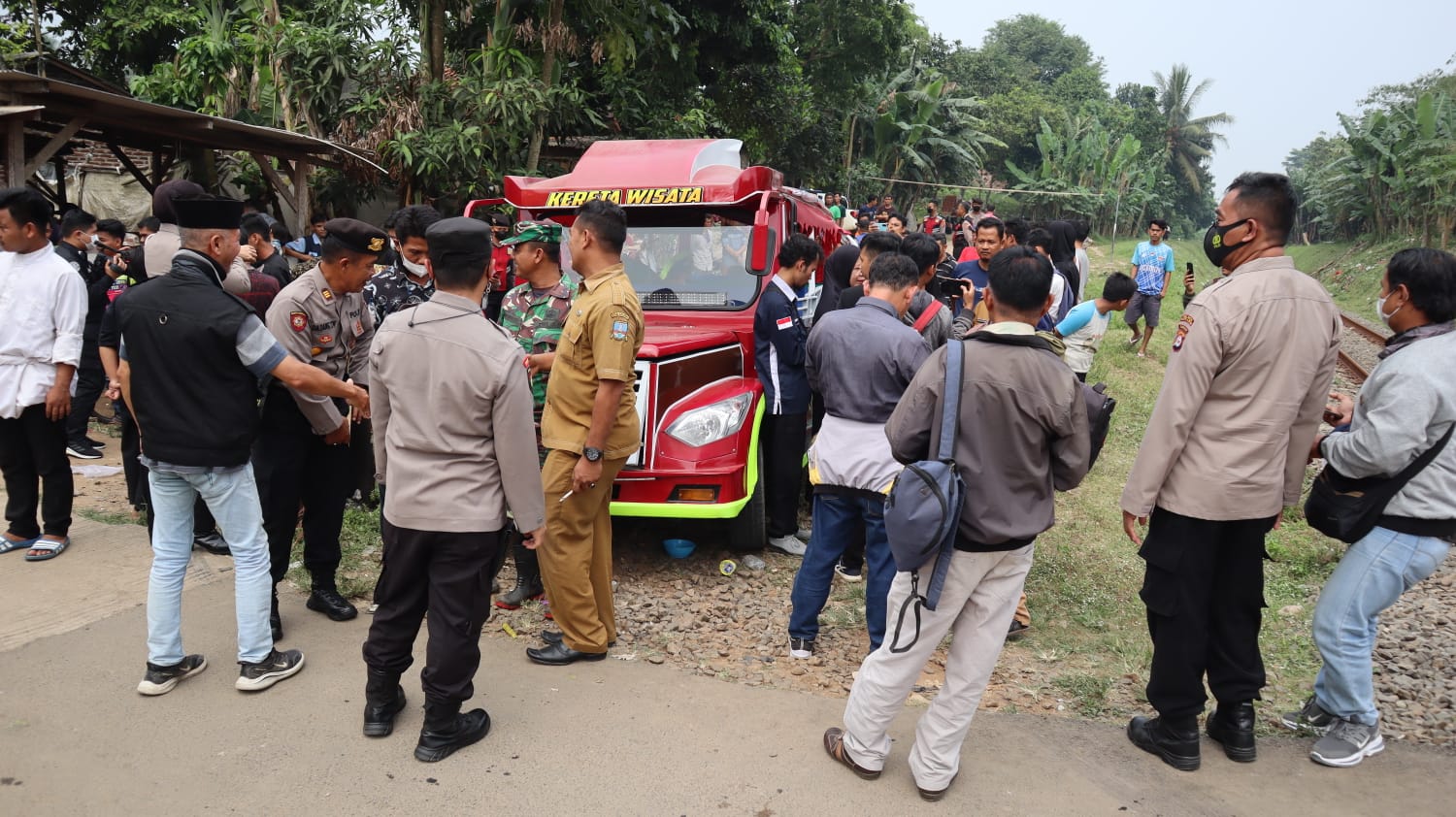 Saat kejadian, sopir membawa 33 penumpang dan berjalan sambil mendengar musik dengan suara keras. Diduga kecelakaan akibat kelalaian sopir saat melintas di perlintasan kereta api tanpa palang pintu. (Bidhumas)