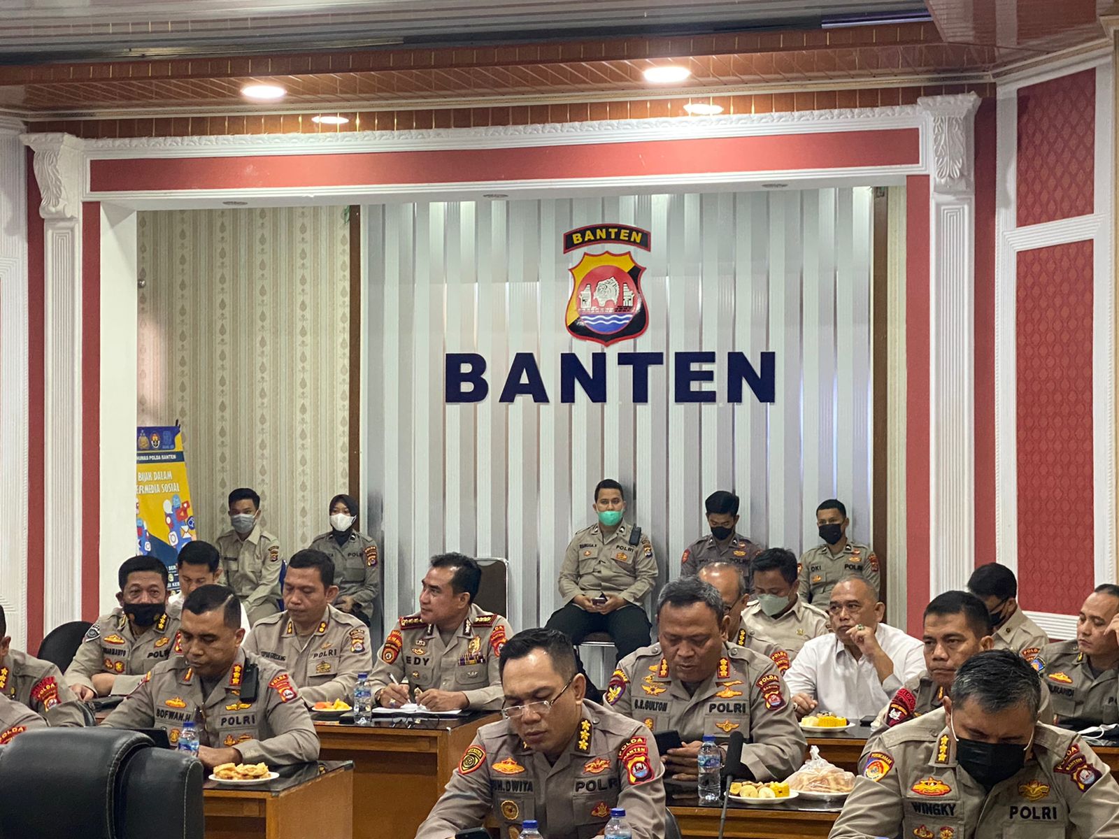 Serang – Komandan Satuan Brimob Polda Banten Kombes Pol Dede Rojudin memgikuti coffe morning dan anev mingguan bertempat di ruang perjamuan dan ruang vicon Polda Banten dipimpin oleh Wakapolda Banten Brigjen Pol. Drs. Ery Nursatari bersama para Pejabat Utama Polda Banten pada Senin (22/08).