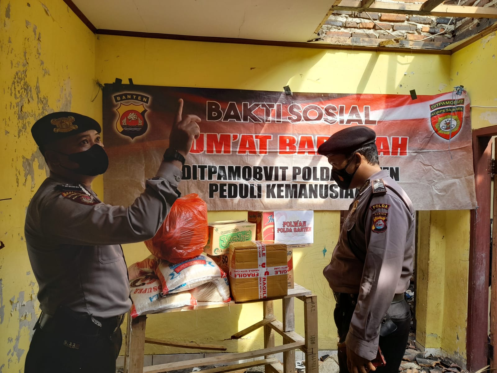 Pada saat pemberian bantuan, Kombes Pol Edy Sumardi Priadinata, S.I.K., M.H mengatakan Jumat Barokah Ditpamobvit Polda Banten memberikan bantuan sembako berupa Beras 3, karung, Indomie 3 Dus, Gula 2, Kopi 1, Susu 2, Minyak 2 dan pakaian layak pakai.