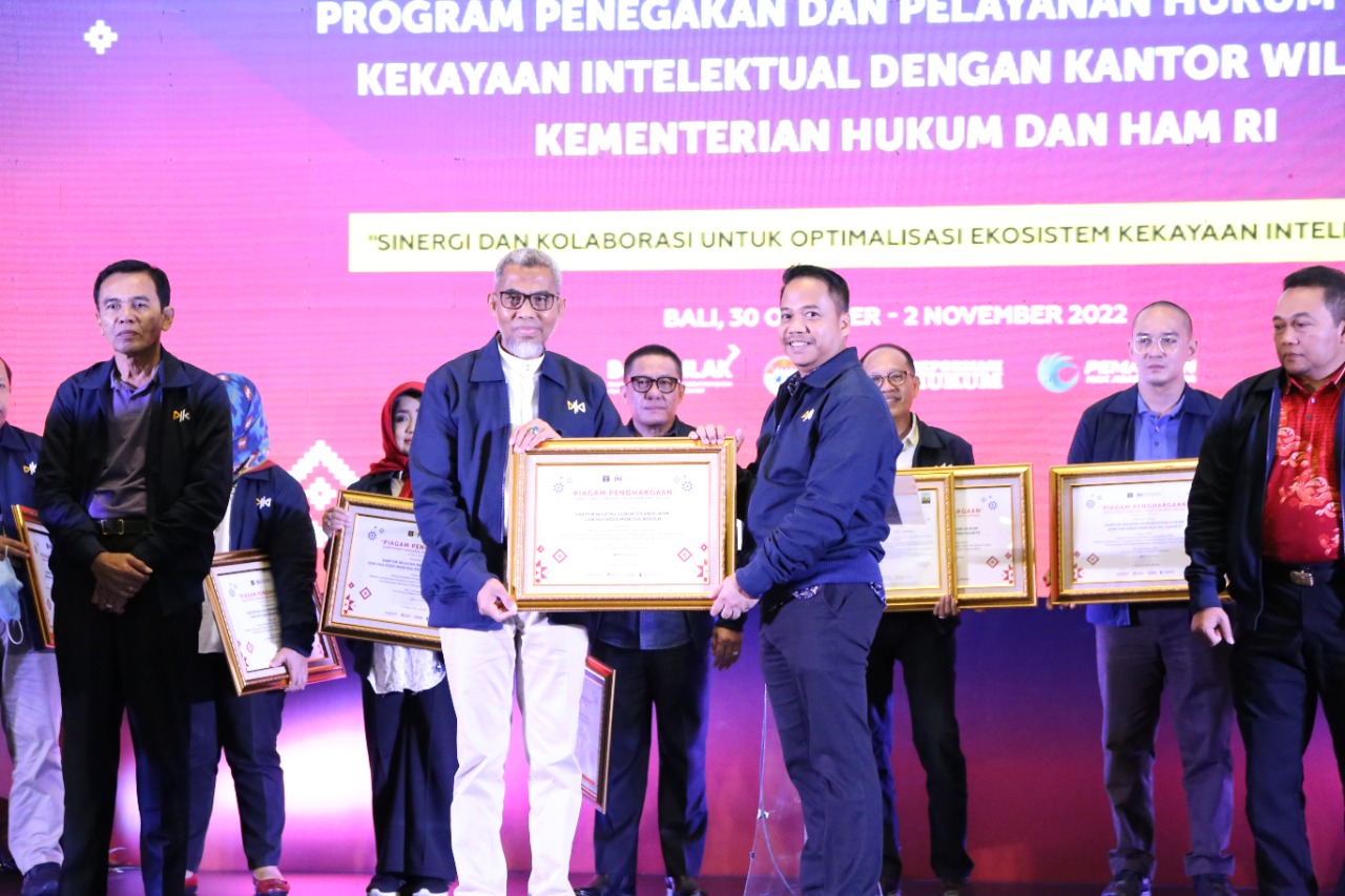 BALI, (Haluanbanten.co.id) – Kantor Wilayah Kementerian Hukum dan HAM Banten kembali terima penghargaan dari Direktorat Jenderal Kekayaan Intelektual (DJKI) dalam rangkaian acara penutupan Rapat Koordinasi Teknis Kinerja Program Penegakan dan Pelayanan Hukum Bidang Kekayaan Intelektual di The Anvaya Beach Resort Bali pada malam 1 November 2022. Total sudah 4 (empat) penghargaan yang diterima Kanwil Banten dari acara di Pulau Dewata tersebut.
