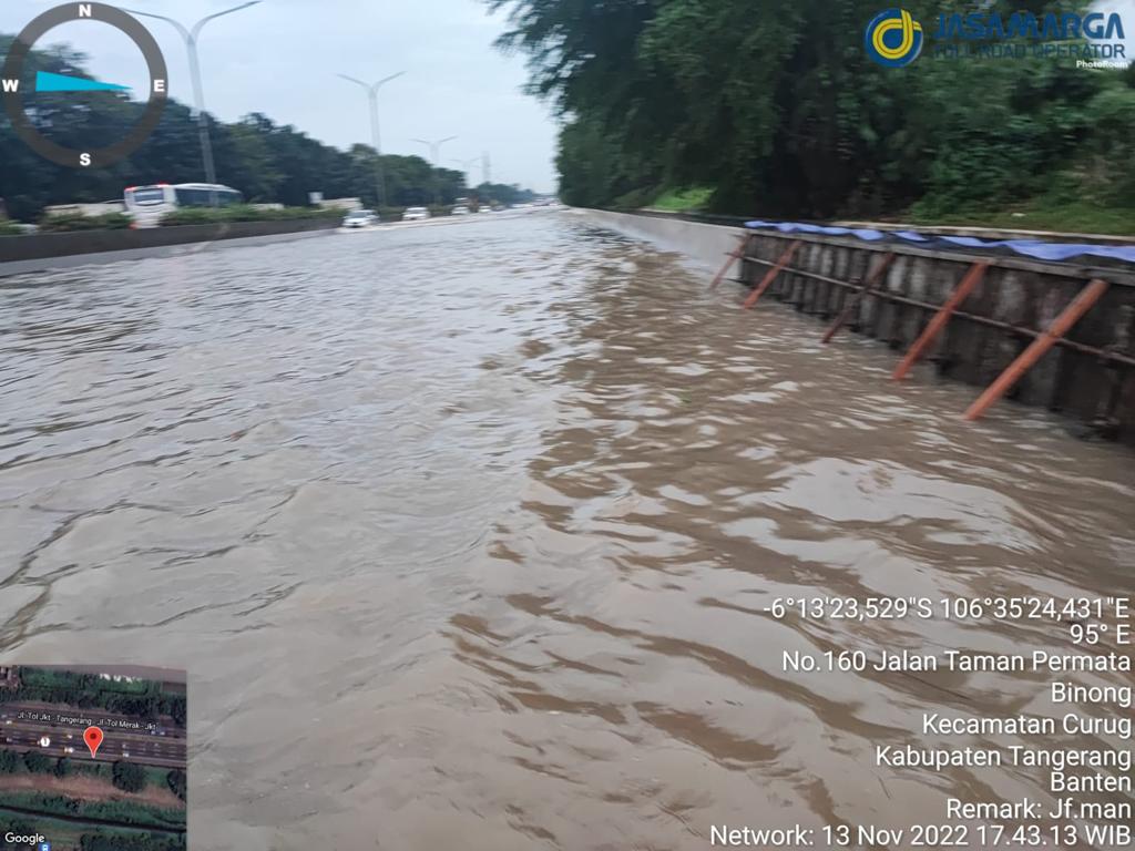 – pasca hujan deras di wilayah Tangerang dan beberapa wilayah lainnya di Banten, terjadi peningkatan air di jalur tol Bitung Tangerang, ketinggian air hingga saat ini lebih dari 1 m