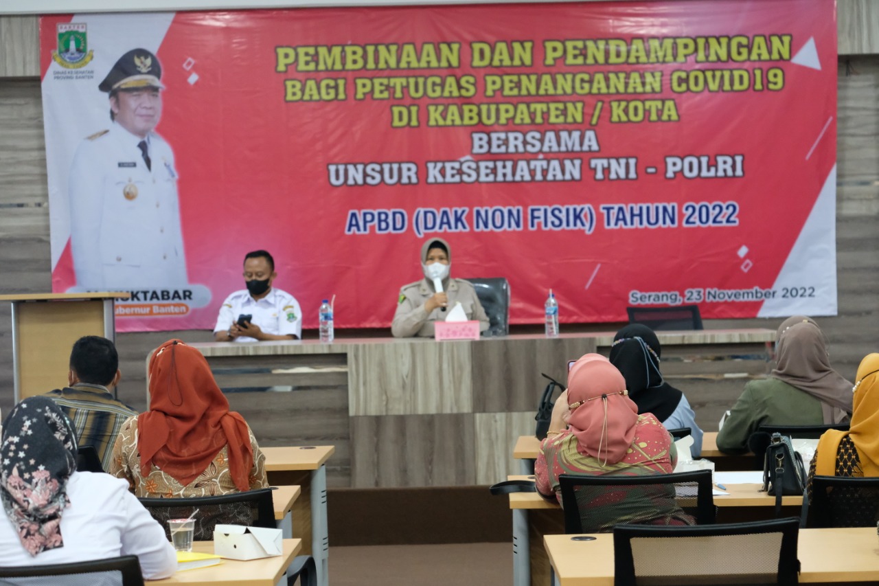 Serang – Kabiddokkes Polda Banten Kombes Pol dr. Agung Widodo diwakili Ahli Madya 2 Biddokkes Polda Banten Pembina TK. I dr. Nurlita, dihari kedua menjadi narasumber dalam kegiatan pembinaan dan pendampingan bagi petugas penanganan Covid-19 bersama unsur kesehatan TNI-Polri yang bertempat di Dinas Kesehatan Provinsi Banten pada Rabu (23/11).