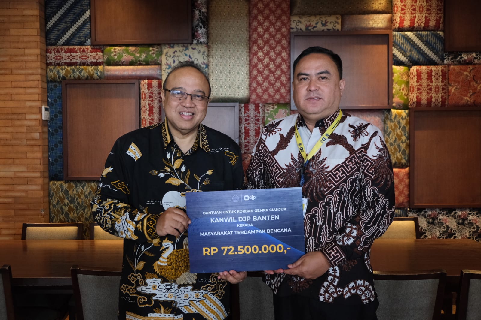 Tangerang, (haluanbanten.co.id) – Kepala Kanwil DJP Banten mewakili seluruh pegawai di lingkungan Kanwil DJP Banten menyampaikan bantuan berupa uang tunai bagi para korban bencana gempa bumi di Cianjur. Bantuan disampaikan melalui Kepala Kantor Pelayanan Pajak (KPP) Pratama Cianjur Rudi Munandar di Karawaci, Kota Tangerang.