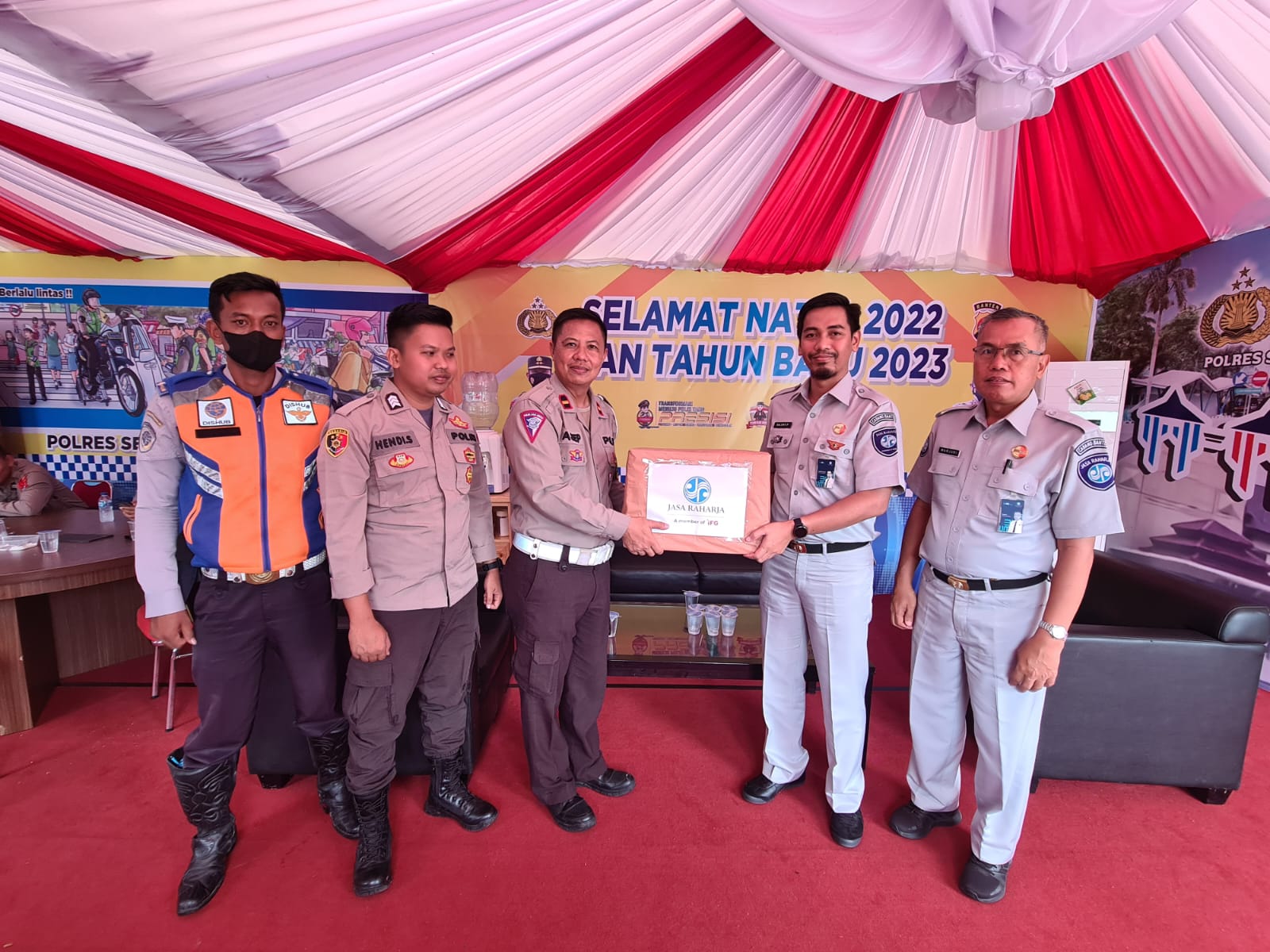 Serang, (haluanbanten.co.id) – tanggal 29 Desember 2022, Kepala Jasa Raharja Cabang Banten Saldhy Putranto beserta Kasubag Pelayanan Marjuki melakukan kunjungan ke posko-posko PAM Nataru 2022, kegiatan ini bertujuan untuk silaturahmi kepada petugas posko PAM Nataru Prov. Banten, dalam kunjungan tersebut kepala PT Jasa Raharja sekaligus menyerahkan bingkisan bagi petugas jaga.