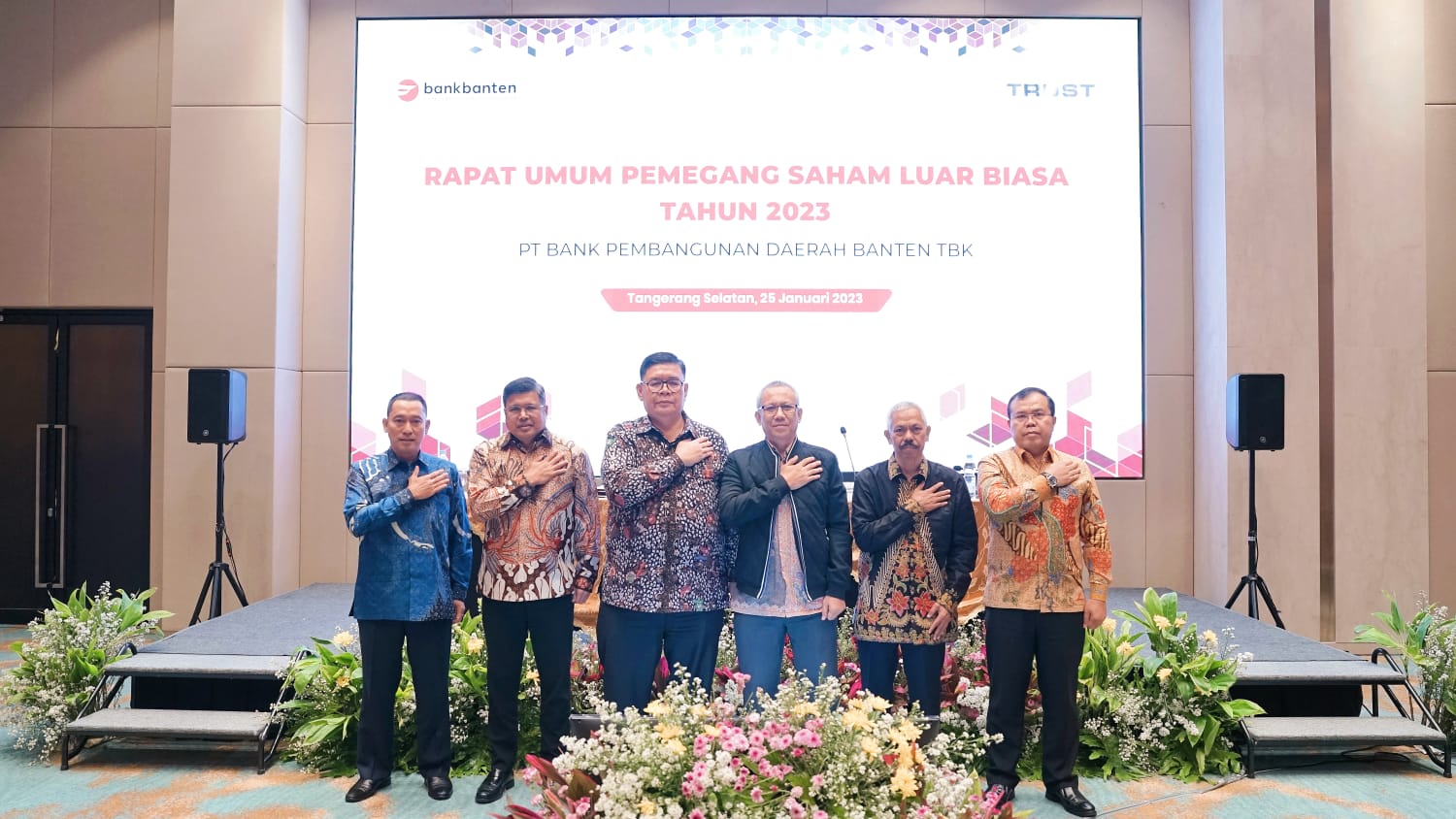 Tangerang Selatan – PT Bank Pembangunan Daerah Banten Tbk (BEKS/Bank Banten) menyelenggarakan Rapat Umum Pemegang Saham Luar Biasa (RUPSLB) Tahun 2023 yang digelar pada Rabu (25/1/2023) di Ballroom Hotel Trembesi, Tangerang Selatan, Banten, dihadiri antara lain oleh Asisten Daerah II Pemprov. Banten, M. Yusuf beserta jajaran OPD Pemprov. Banten; Ketua Komisi III DPRD Provinsi Banten Muhammad Faizal; Deputi Kepala Bank Indonesia Banten, Agus Hartanto; Dewan Komisaris dan Direksi PT Banten Global Development selaku Pemegang Saham Pengendali Perseroan; serta Dewan Komisaris dan Direksi Bank Banten.