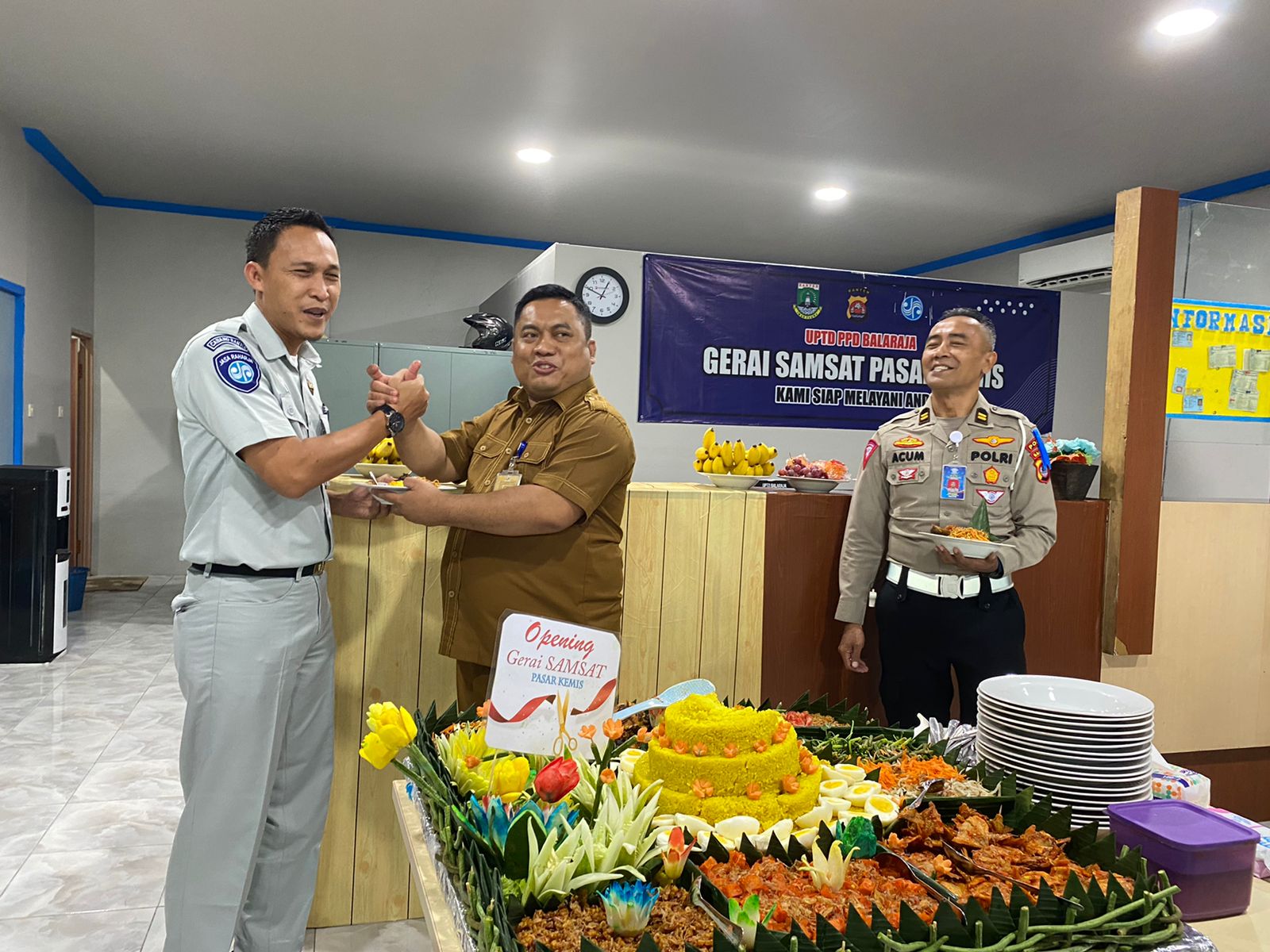 KUPT Samsat Balaraja Moh. Ali Hanapiah membuka dengan pemotongan tumpeng seraya dengan harapan dan doa agar pembukaan tempat baru gerai pasar kami ini lebih strategis dekat dengan lingkungan masyarakat agar lebih mudah dalam membayar pajak, seraya di amini juga dari sambutan Paur STNK yaitu Acum semoga kedepannya lebih meningkatkan pendapatan Gerai Pasar Kamis, juga tidak lupa Penanggung Jawab PT Jasa Raharja Samsat Balaraja Retno Saputra berharap dengan dekatnya tempat aktivitas masyarakat yaitu dikawasan pasar semakin membantu masyarakat saat belanja kebutuhan sekaligus membayar pajak.