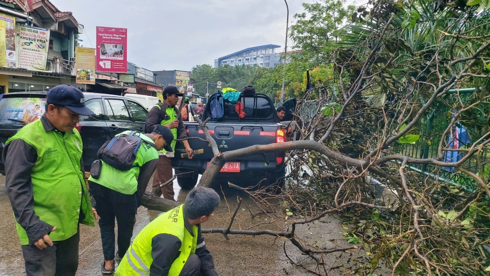 Kepala Disbudpar, Rizal Ridolloh mengungkapkan ada 14 titik pohon tumbang yang ditangani jajaran Bidang Pertamanan. “Sejak malam, petugas sudah turun siap siaga melakukan penanganan pohon tumbang, dengan menggunakan alat berat dan puluhan personil. Kini pohon tumbang telah selesai ditangani dan dalam proses pengangkutan,” ungkap Rizal.