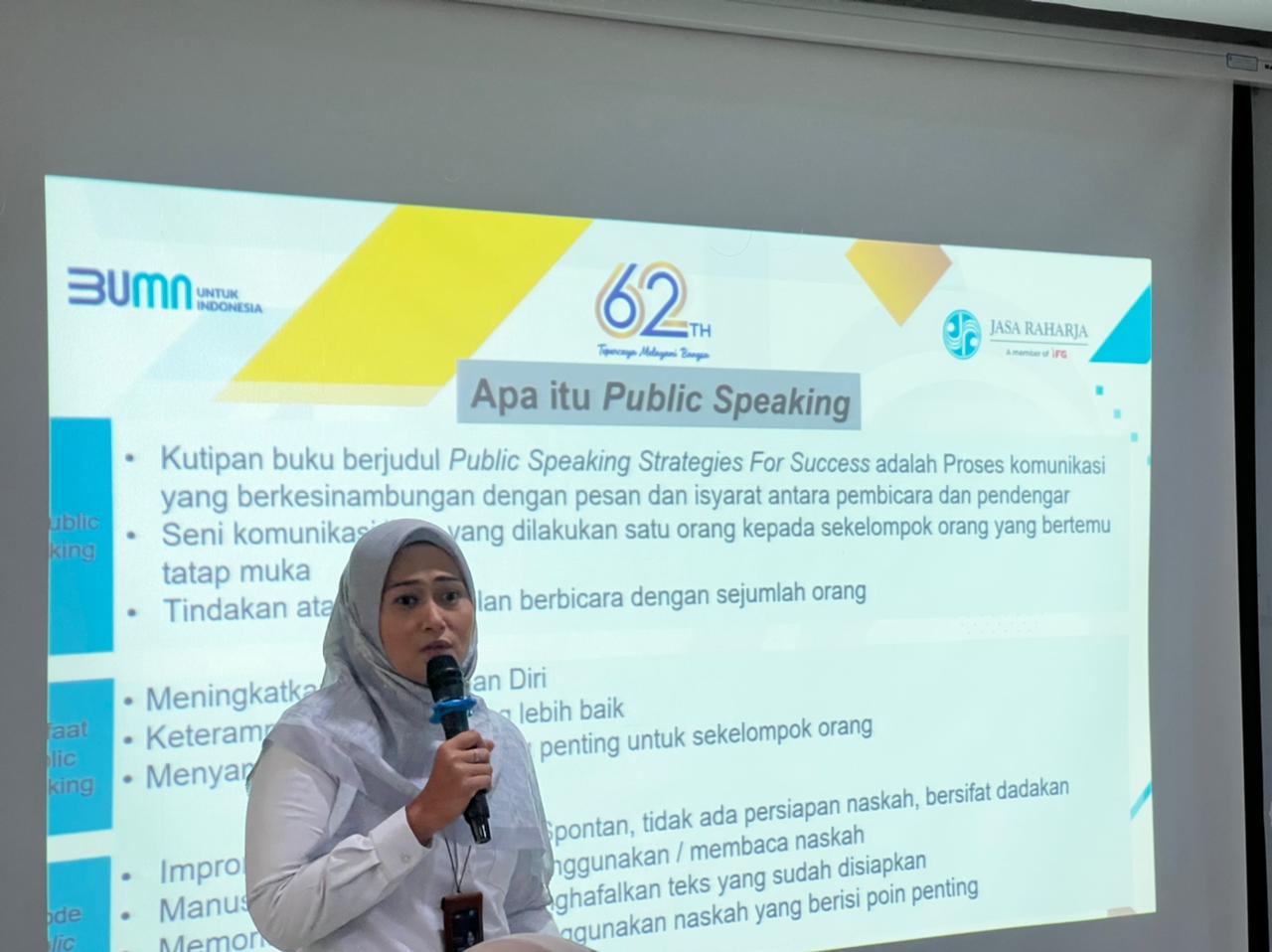Dalam Acara Jasa Raharja Mengajar, Tina Yustika berikan materi Public Speaking kepada mahasiswa/i yang tergabung dalam komunitas MRTC (Millennials Road Traffic Club).