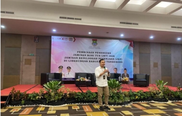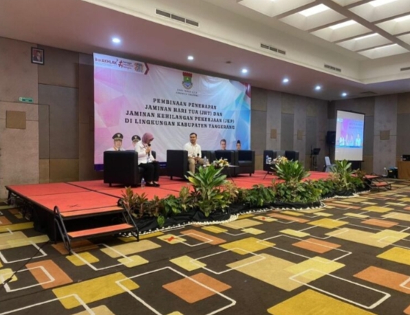 Acara ini bertajuk Pembinaan Jaminan Hari Tua (JHT) dan Jaminan Kehilangan Pekerjaan (JKP) 2023 terhadap manajemen perusahaan dan pekerja di Kabupaten Tangerang.