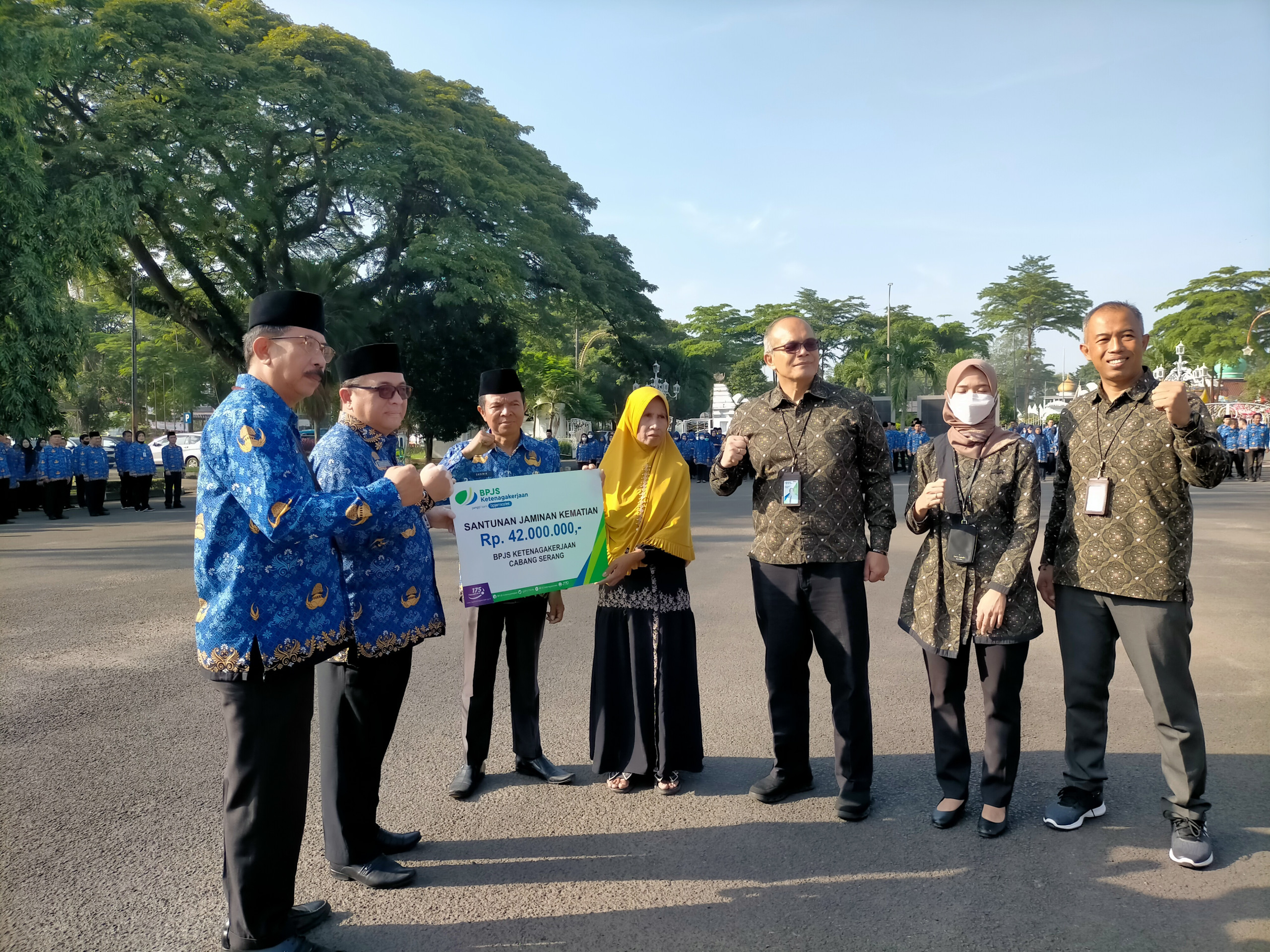 Santunan tersebut diserahkan oleh Staf Ahli bupati Serang bidang SDM Dr. Rahmat Fitriadi didampingi Kepala BPJS Ketenagakerjaan Cabang Serang, Ahmad Fathoni kepada ahli waris dari almarhumah Sumiyati usai kegiatan upacara peringatan Hari Kesadaran Nasional tingkat Kabupaten Serang di halaman Pendopo Kabupaten Serang, Jum’at (19/03/2023).
