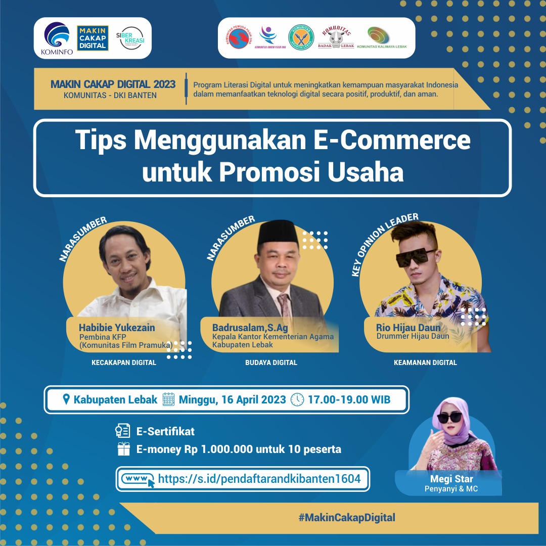 Membahas tema ”Tips Menggunakan e-Commerce untuk Promosi Usaha”, diskusi luring (offline) tersebut menghadirkan narasumber: Pembina Komunitas Film Pramuka (KFP) Habibie Yukezain, Kepala Kantor Kemenag Kabupaten Lebak Badrusalam, musisi Rio Hijau Daun selaku key opinion leader, dan penyanyi Megi Star sebagai moderator.