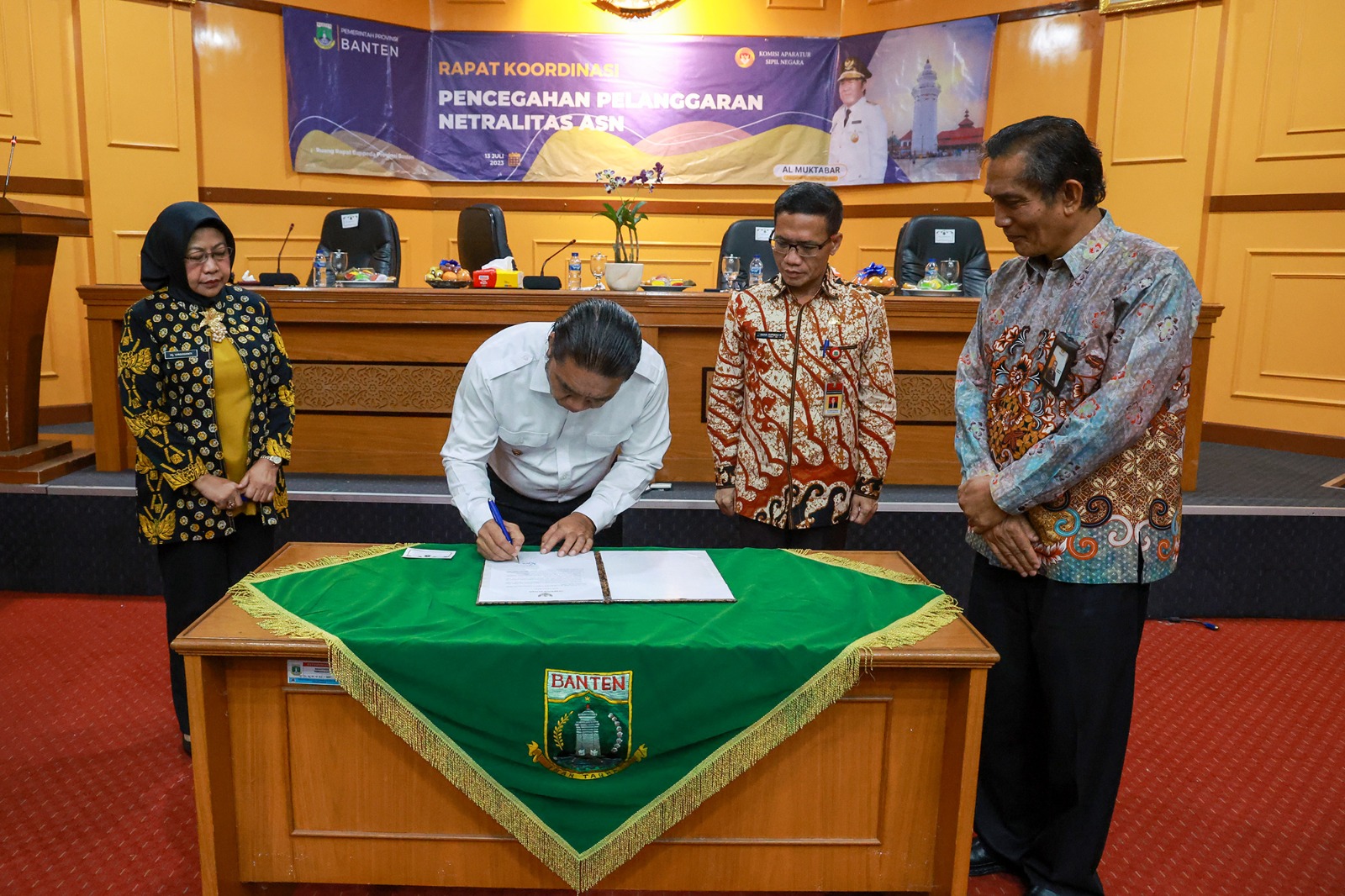 Selain Al Muktabar, Pelaksana Harian (Plh) Sekretaris Daerah Virgojanti dan Kepala Badan Kepegawaian Daerah (BKD) Provinsi Banten Nana Supiana turut menandatangani Pakta Integritas tersebut.