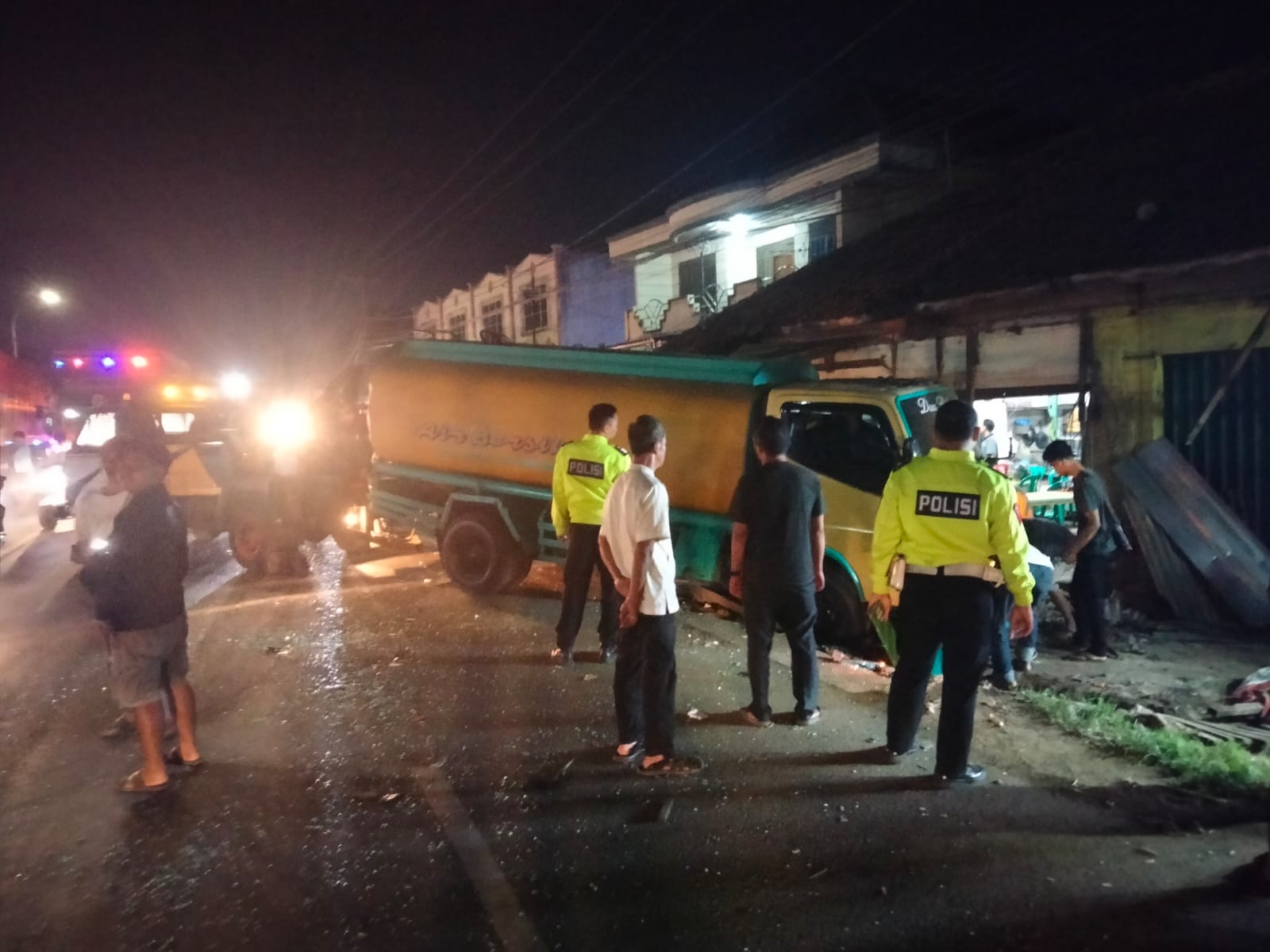 Akibat benturan keras dari belakang, mobil Mitsubishi tangki terdorong dan menabrak kembali bangunan ruko pecel lele dan tempat cukur. Selain bangunan toko yang hancur, delapan motor yang berjejer terparkir juga menjadi korban.