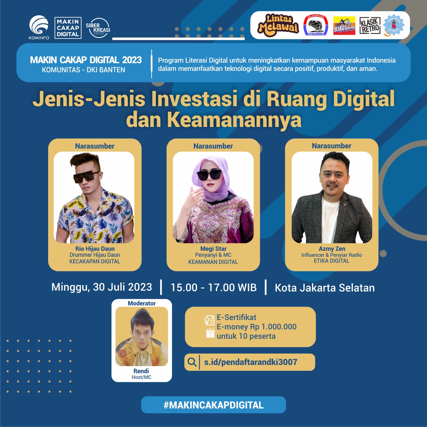 Diskusi luring (offline) bertajuk ”Jenis-jenis Investasi di Ruang Digital dan Keamanannya” itu akan menghadirkan tiga narasumber. Mereka adalah anggota kelompok musik Hijau Daun Rio, penyanyi Megi Star, influencer Azmy Zen, dan Rendi selaku moderator.