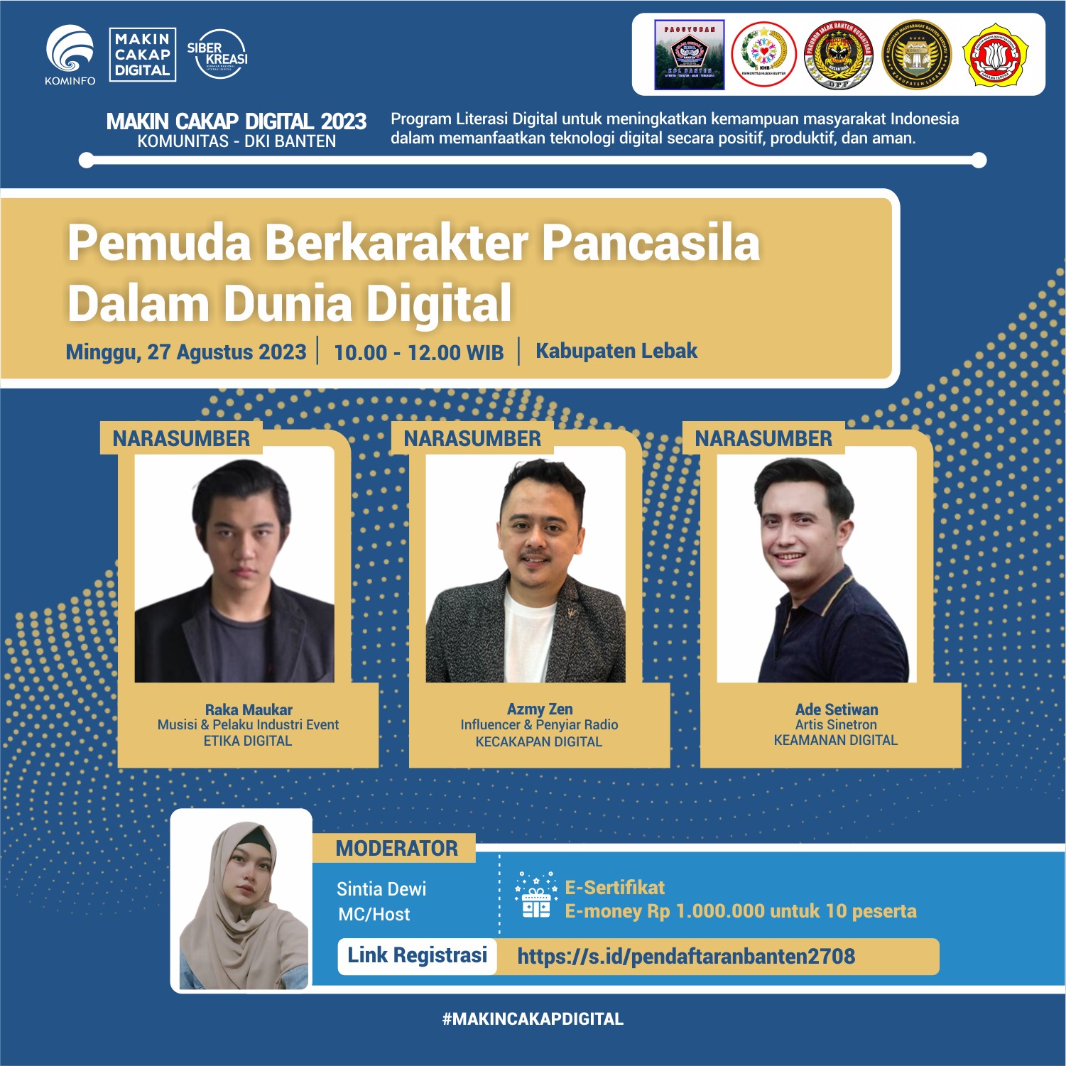 ”Diskusi literasi digital masuk desa lintas komunitas ini bisa diikuti gratis. Caranya, silakan mendaftar secara online ke link registrasi di https://s.id/pendaftaranbanten2708. Peserta akan mendapat e-sertifikat resmi dari Kemenkominfo dan e-money senilai Rp 1 juta untuk 10 peserta yang beruntung,” tulis Kemenkominfo dalam rilisnya kepada awak media, Sabtu (26/8).
