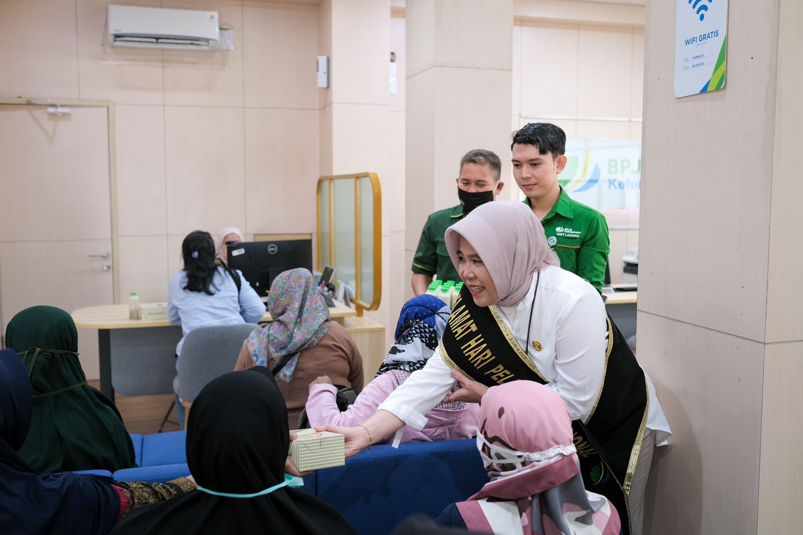 Pada kesempatan ini, terlihat seluruh karyawan BPJS Ketenagakerjaan Cabang Kabupaten Tangerang menggunakan dresscode kemeja putih dan celana warna khaki sedang menyambut dan beramah tamah dengan peserta yang datang ke BPJS Ketenagakerjaan Kantor Cabang Kabupaten Tangerang.