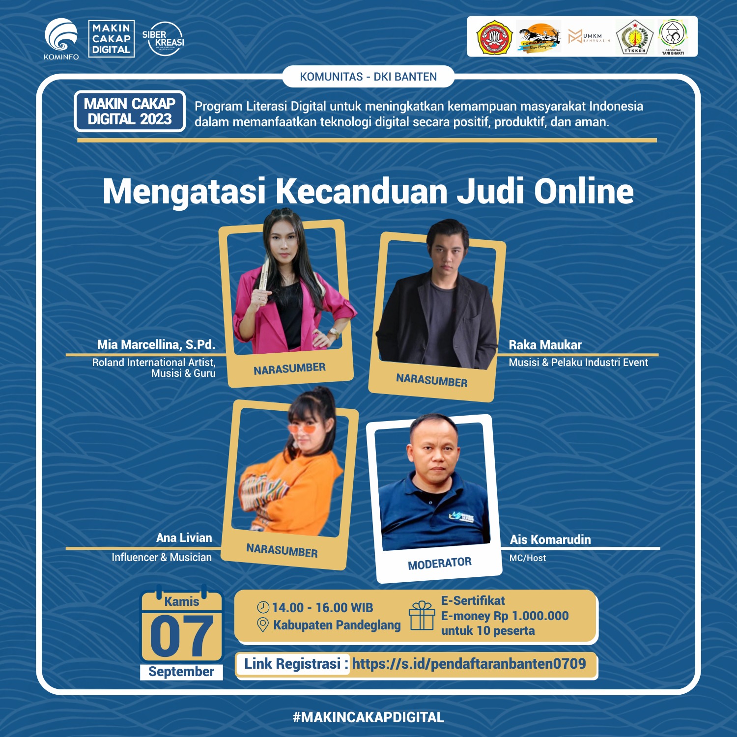 Mengusung tema ”Mengatasi Kecanduan Judi Online”, diskusi akan menghadirkan tiga narasumber. Mereka adalah artis Roland International Mia Marcelina, musisi Raka Maukar, influencer Ana Livian, dan Ais Komarudin selaku moderator.