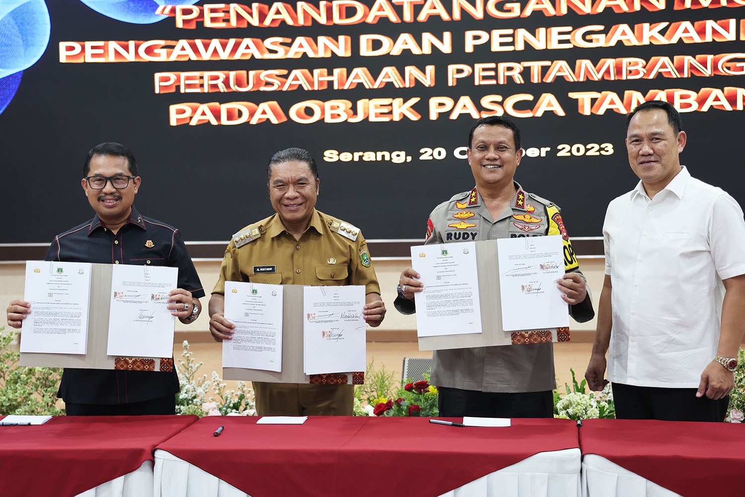 Penjabat (Pj) Gubernur Banten Al Muktabar tandatangani kesepakatan bersama dan pakta integritas penegakan hukum perusahaan pertambangan pada objek pasca tambang antar Kepala Kepolisian Daerah (Polda) Banten Irjen Pol Rudy Heriyanto Adi Nugroho, Kepala Kejaksaan Tinggi (Kajati) Banten Didik Farkhan Alisyahdi, serta Inspektur Pertambangan Kementerian ESDM Harry Nurdiansyah di Ruang Pertemuan Markas Kepolisian Daerah Banten, Jl Syech Nawawi Al Bantani, Banjarsari, Kota Serang, Jum’at (20/10/23).