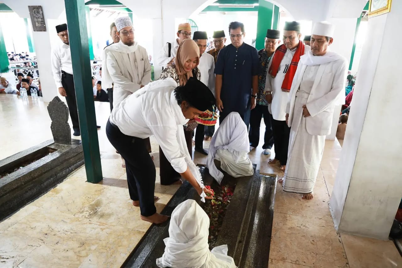 Penjabat (Pj) Gubernur Banten Al Muktabar bersama Forum Dzurriyat Kesultanan Banten dan Perkumpulan Urang Banten (PUB) melakukan ziarah ke makam KH Tubagus Achmad Chatib Al Bantani di komplek Masjid Agung Banten Kecamatan Kasemen Kota Serang, Sabtu (28/10/2023). KH Tubagus Achmad Chatib merupakan ulama, pejuang perintis kemerdekaan serta tokoh perlawanan kepada penjajah.