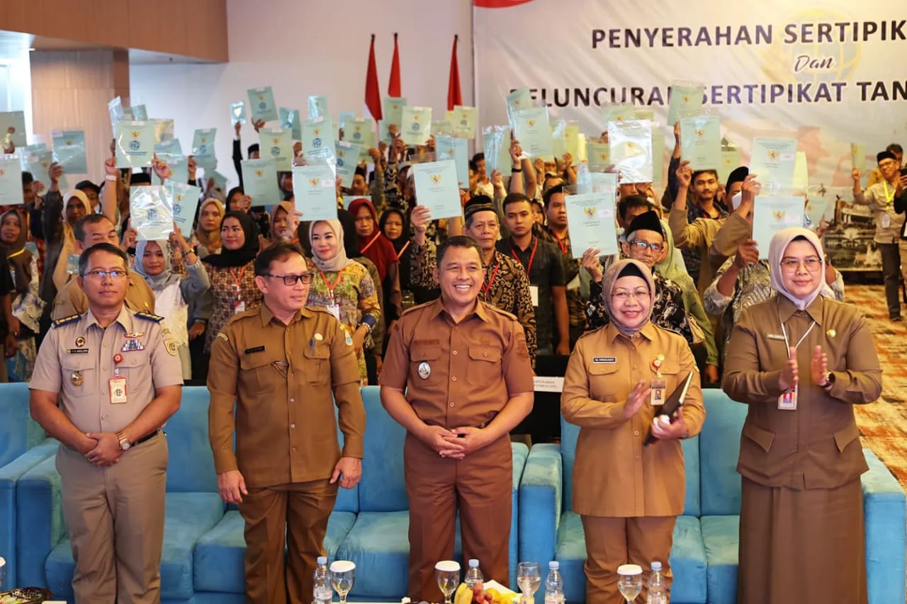 Penjabat (Pj) Sekda Provinsi Banten Virgojanti menghadiri penyerahan sertipikat tanah dan peluncuran sertipikat tanah elektronik yang dilakukan serentak seluruh Indonesia melalui virtual bersama Presiden Jokowi.
