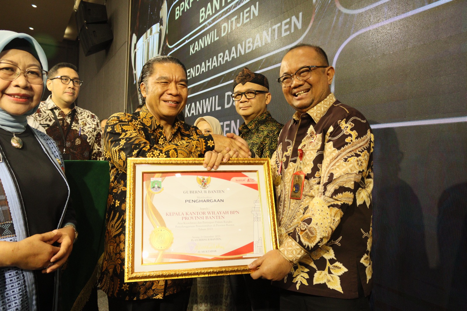 SERANG, (Haluanbanten.co.id) – Kepala Kantor Wilayah Badan Pertanahan Nasional (BPN) Provinsi Banten (Kakanwil BPN Banten) menerima Piagam Penghargaan atas Partisipasi dalam Penyelenggaraan Pemerintah di Provinsi Banten Tahun 2023 dari Pemerintah Daerah Provinsi Banten.