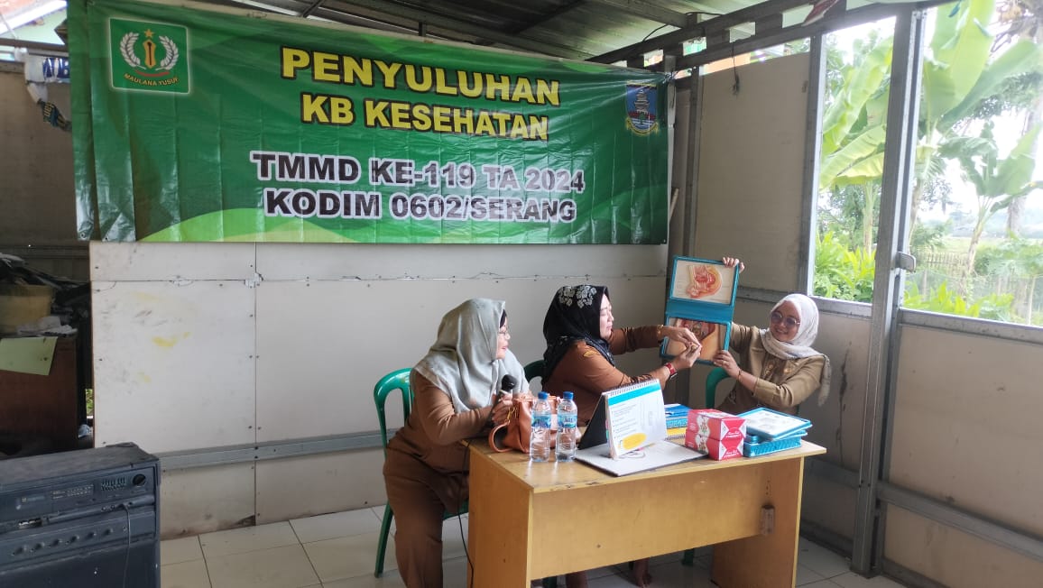 SERANG, (Haluanbanten.co.id) – Satuan Penugasan (Satgas) TNI Manunggal Membangun Desa (TMMD) Ke-119 Kodim 0602/Serang bekerjasama dengan Pemerintah Kabupaten (Pemkab) Serang dan instansi terkait menggelar penyuluhan tentang KB Kesehatan bertempat di Posko TMMD Desa Bojong Pandan, Kecamatan Tunjung Teja, Kabupaten Serang, Provinsi Banten, Selasa (27/02/2024).
