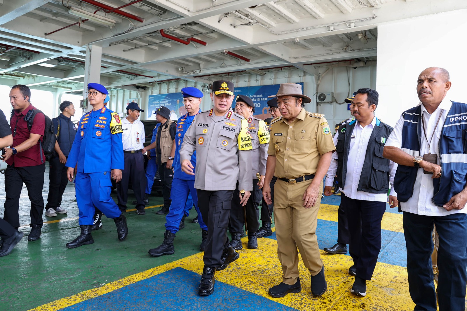 Penjabat (Pj) Gubernur Banten Al Muktabar mendampingi Menteri Kesehatan (Menkes) Budi Gunadi Sadikin dan Kepala Badan Pemelihara Keamanan Polri (Kabaharkam) Komisaris Jenderal Polisi Mohammad Fadil Imran meninjau Posko Kesehatan dan Arus Mudik Lebaran 2024, Selasa (9/4/2024). Peninjauan Posko Kesehatan dilakukan bersama Menkes Budi Gunadi Sadikin di Pelabuhan Ciwandan. Sementara peninjauan arus mudik dilakukan di Pelabuhan Merak bersama Kabaharkam Polri Komisaris Jenderal Polisi Mohammad Fadil Imran.