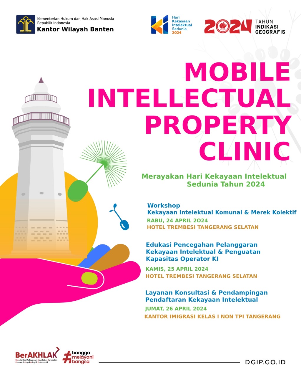 Mengundang ratusan Pelaku UMKM serta Stakeholders terkait Kekayaan Intelektual, kegiatan akan digelar selama 3 (tiga) hari terhitung mulai 24 April s.d. 26 April mendatang di Trembesi Hotel Kota Tangerang Selatan dan Kanim Kelas I Non TPI Tangerang.