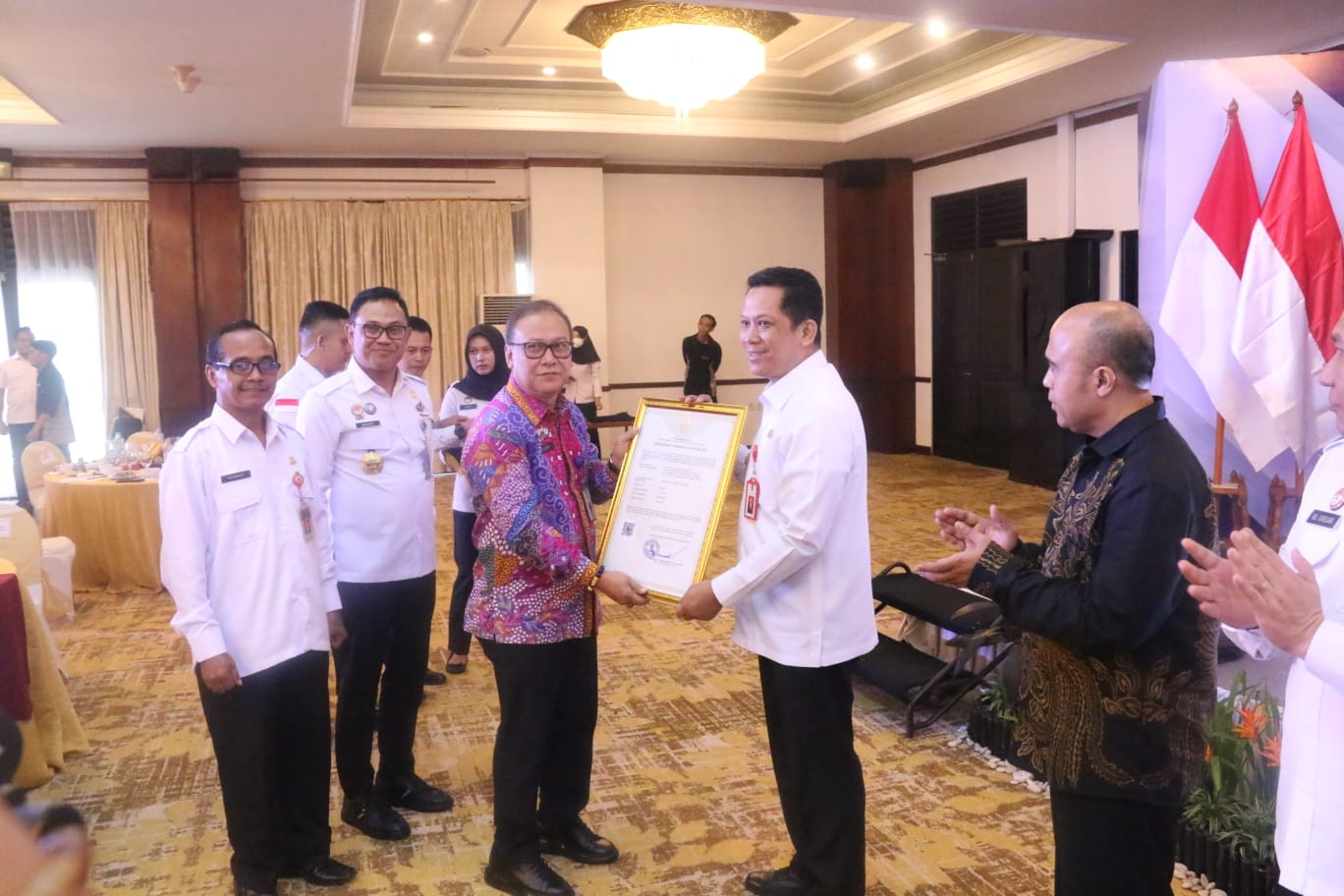 Sertifikat diserahkan Staf Ahli Menkumham Bidang Ekonomi, Lucy Agung Binarto kepada Pj. Bupati Tangerang, Andi Ony dalam rangkaian Diseminasi dan Penguatan Pendaftaran Indikasi Geografis yang digelar Kanwil Kemenkumham Banten di Aryaduta Hotel Tangerang, Rabu (22/05).