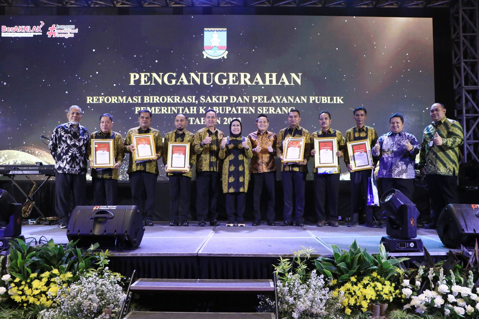 Secara simbolis penghargaan diserahkan oleh Bupati Serang Ratu Tatu Chasanah pada Penganugerahan Reformasi Birokrasi, SAKIP dan Pelayanan Publik Pemerintah Kabupaten Kabupaten Serang Tahun 2023 pada Senin, 3 Juni 2024 malam di Grand Soll Marina Hotel Tangerang.