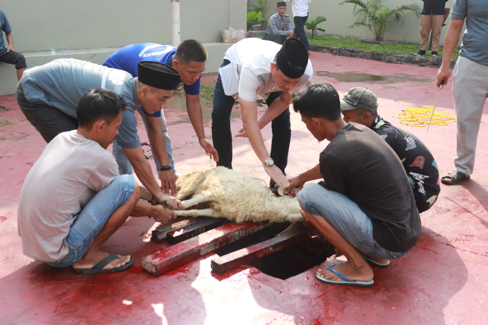 Proses penyembelihan disaksikan langsung oleh Kepala Kantor Wilayah Kementerian Hukum dan HAM Banten Bapak Dodot Adikoeswanto beserta Jajaran Kanwil Kemenkumham Banten.