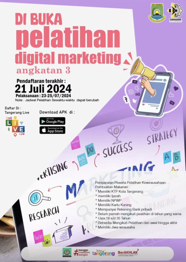 Kota Tangerang, (Haluanbanten.co.id) – Terus menghadirkan kesempatan atau peluang kerja untuk masyarakat Kota Tangerang, Pemerintah Kota (Pemkot) Tangerang melalui Dinas Ketenagakerjaan (Disnaker) kembali membuka kelas pelatihan kewirausahaan bidang Digital Marketing Angkatan 3 secara gratis.