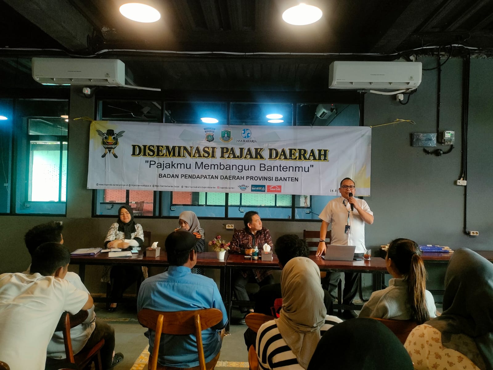 Tangerang, (haluanbanten.co.id) – Jasa Raharja Perwakilan Tangerang dalam rangka membangun kesadaran serta meningkatkan pemahaman, pengetahuan dan wawasan terkait Pajak Daerah Provinsi Banten, melakukan giat sosialisasi Diseminasi Pajak Daerah dengan tema “Pajakmu Membangun Bantenmu” yang bertempat di Bintaro, Tangerang Selatan. Selaku narasumber mewakili Jasa Raharja Perwakilan Tangerang kegiatan sosialisasi ini disampaikan oleh Staff Administrasi Samsat Gerai Bintaro, Rama Adhitya Budiarto. (18/07/2024).