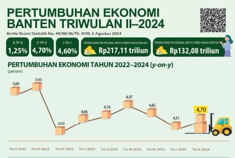 Berdasarkan Berita Resmi Statistik BPS Provinsi Banten No.40/08/36/Th.XVIII, Senin (5/8/2024), perekonomian Provinsi Banten pada Triwulan II-2024, berdasarkan Produk Domestik Regional Bruto (PDRB) atas dasar harga berlaku, mencapai Rp217,11 triliun. Sedangkan berdasar atas harga konstan tahun 2010, perekonomian Provinsi Banten mencapai Rp132,08 triliun.