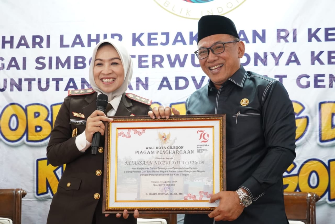 CILEGON, Wali Kota Cilegon Helldy Agustian memberikan penghargaan kepada Kejaksaan Negeri (Kejari) Cilegon saat Peringatan Hari Lahir Kejaksaan Republik Indonesia (RI) ke-79, di kantor Kejari setempat, Senin 2 September 2024. Penghargaan yang diterima Kepala Kejari Kota Cilegon Diana Wahyu Widiyanti itu merupakan bentuk apresiasi atas kolaborasi dan kerjasama yang baik dalam penanganan permasalahan hukum dibidang perdata dan tata usaha negara antara Jaksa Pengacara Negara dengan perangkat daerah yang ada di Kota Cilegon.