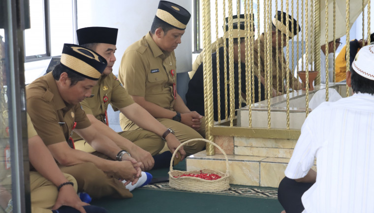 Pj Andi Ony didampingi Pj.Sekda serta kepala OPD dan tokoh masyarakat lakukan berdoa dan menaburkan bunga di makam Raden Aria Wangsakara di Desa Lengkong Kec. Pagedangan.