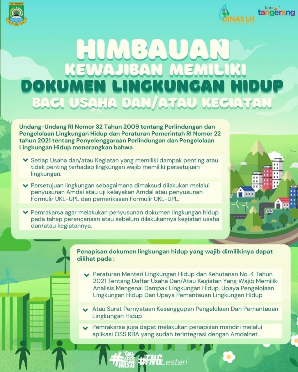 Kepala DLH Kota Tangerang Wawan Fauzi menyatakan, setiap usaha dan kegiatan yang berdampak pada lingkungan, baik besar maupun kecil, wajib memiliki Dokumen Lingkungan Hidup. Diantaranya, Analisis Mengenai Dampak Lingkungan (AMDAL) ataupun Upaya Pengelolaan Lingkungan dan Upaya Pemantauan Lingkungan Hidup (UKL-UPL).