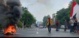 Tak lupa, puluhan mahasiswa juga membakar ban di tengah rintik hujan yang mengguyur Kota Serang, Banten.