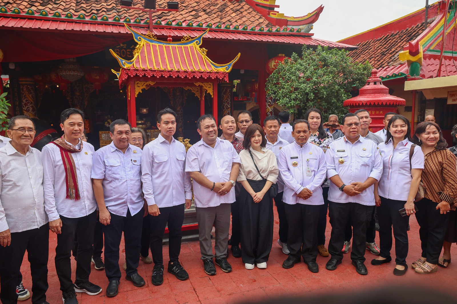 Di dalam Kelenteng, Wapres Gibran bersama Pj Gubernur Banten A Damenta serta rombongan menyaksikan anak-anak yang tengah latihan barongsai, pembersihan klenteng dan pemasangan lampion.