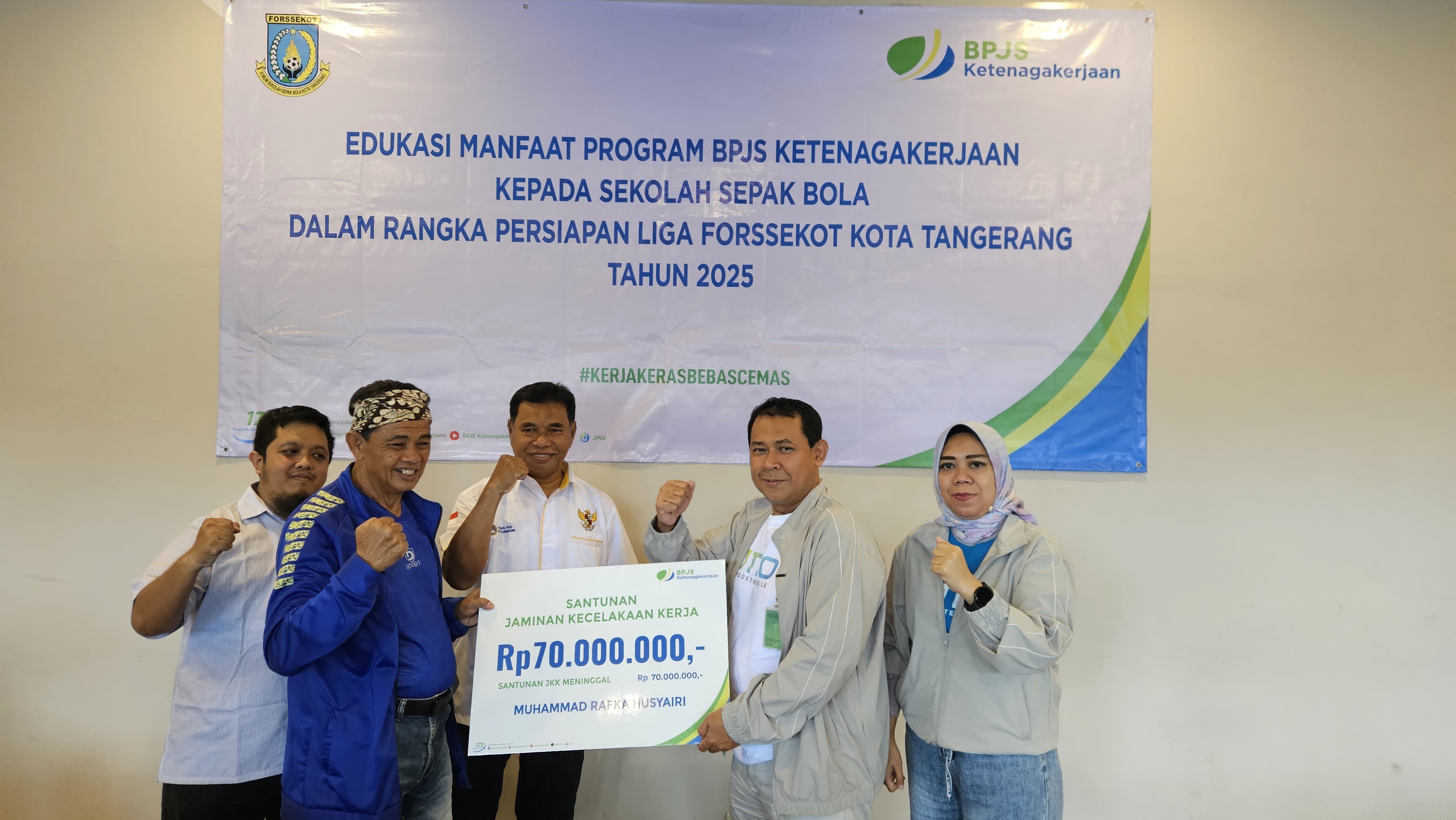 Untuk diketahui, bahwa dalam kegiatan ini juga dilakukan simbolis penyerahan manfaat Santunan untuk ahli waris dari Alm. Muhammad Rafka Husyairi siswa Sekolah Sepak Bola Putra Cisadane yang mengalami kecelakaan lalu lintas pada saat pulang bertanding pada Liga Forssekot Tahun 2024. Ahli Waris menerima santunan kematian dengan total Rp 70.000.000 (Tujuh Puluh Juta Rupiah). (**)